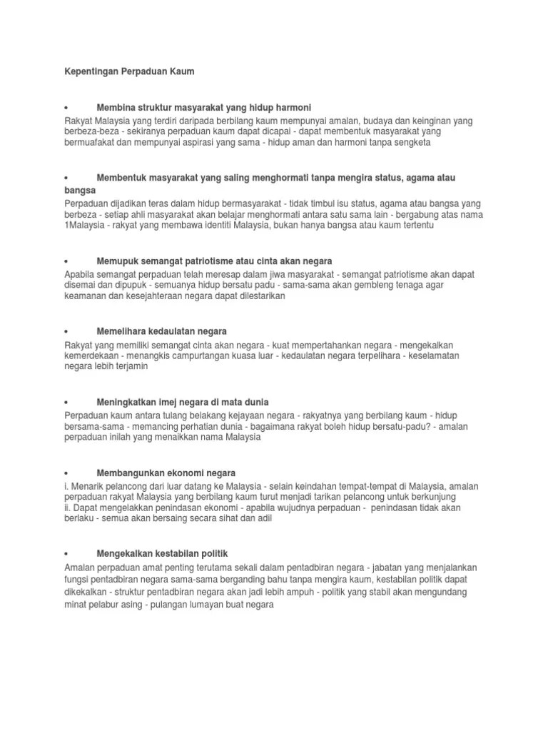 Kepentingan Perpaduan Kaum Memupuk Kesejahteraan from demo.pdfslide.tips Buku in mengupas pelbagai isu tentang agama dan perpaduan kaum di malaysia. Tidak dapat dinafikan bahawa antara sebab utama pelabur asing berani menanam modal di sesebuah negara adalah kerana kestabilan politik dan perancangan kerajaan yang mesra pelabur. By umizah khamis 37129 views. Perpaduan kaum juga memainkan peranan dalam mengukuhkan lagi ekonomi negara dengan penglibatan semua kaum dalam kegiatan ekonomi. Bahan dan rujukan untuk isi berkaitan kepentingan perpaduan kaum. Kepentingan perpaduan kaum di malaysia ialah mewujudkan masyarakat yang harmoni. Perpaduan dalam kalangan pelbagai etnik di negara kita haruslah dikekalkan untuk menjamin keselamatan negara agar kemerdekaan yang kita kecapi sekarang ini berkekalan.hal ini adalah untuk mengelakkan berulangnya perkara yang tidak diingini seperti. Kepentingan perpaduan kaum (bahan rujukan )full description.
