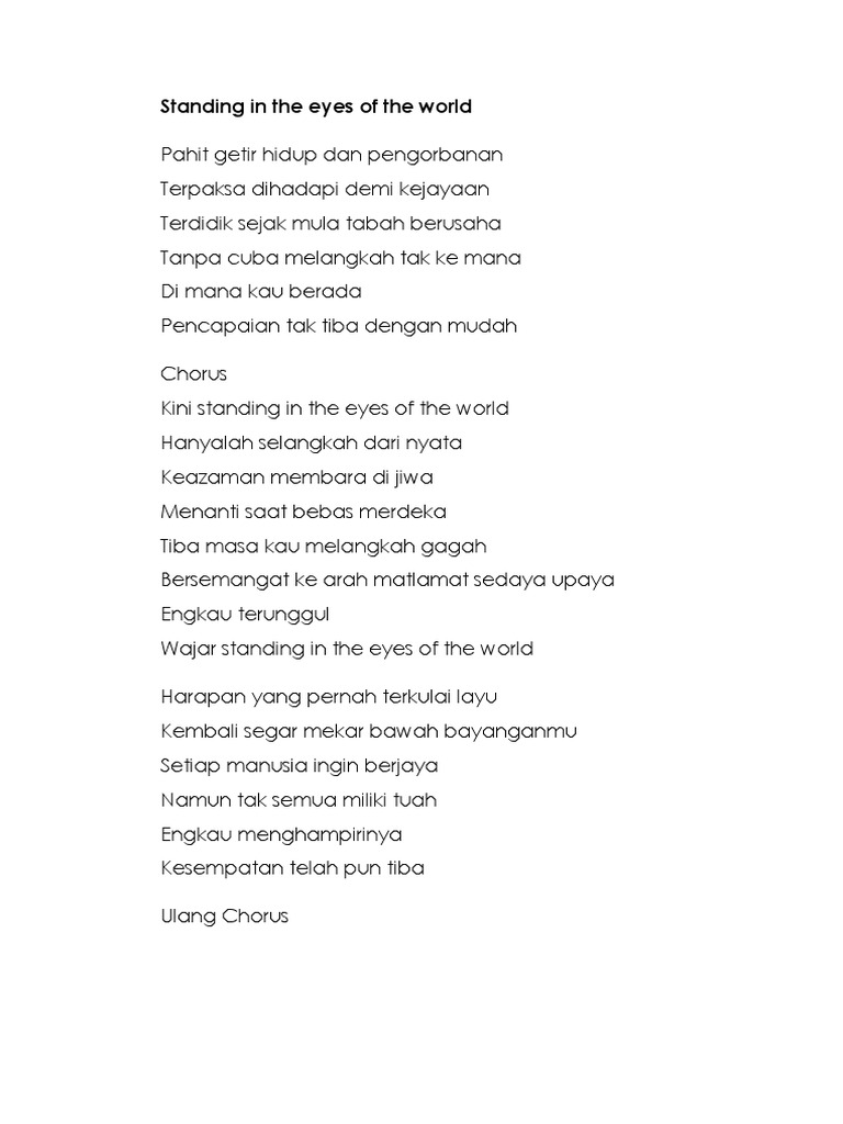 Lirik lagu standing in the eyes of the world. Bersemangat ke arah matlamat sedaya upaya. View lirik lagu standing in the eyes 1 malaysia.docx from aa 1standing in the eyes of the world ella pahit getir hidup. Terdidik sejak mula, tabah berusaha. Tiba masa kau melangkah gagah.